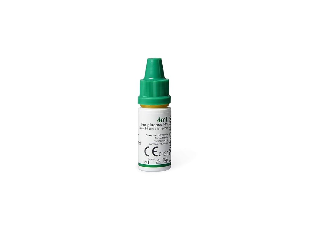Kontrolný roztok slúži na to, aby si overil, či glukomer a testovacie prúžky merajú správne. Nepoužíva sa na meranie tvojej krvi.