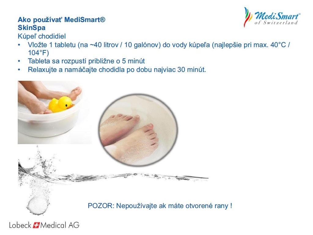 • Vložte 1 tabletu (na ~40 litrov / 10 galónov) do vody kúpeľa (najlepšie pri max. 40°C /